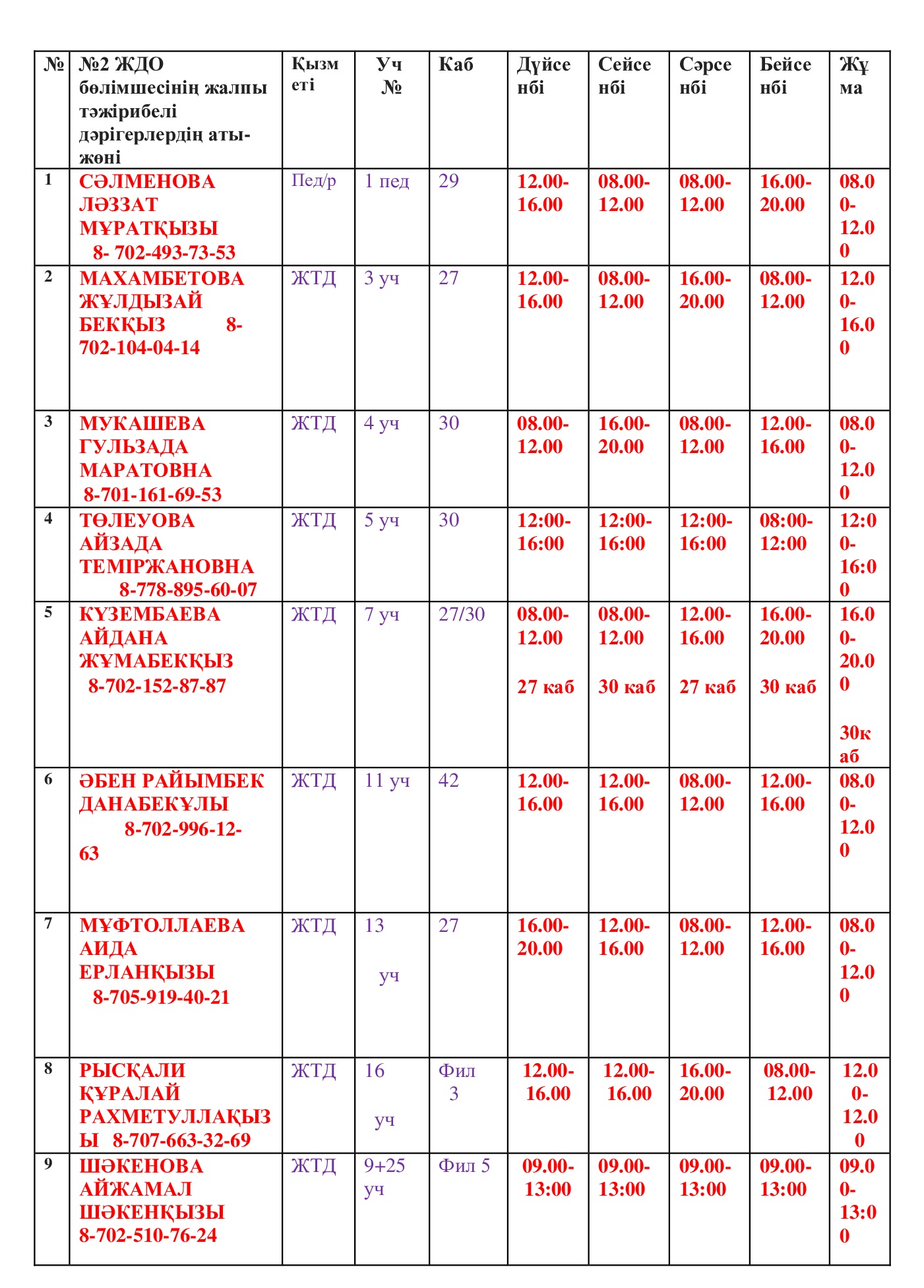 Учаскелік дәрігерлердің қабылдау кестесі